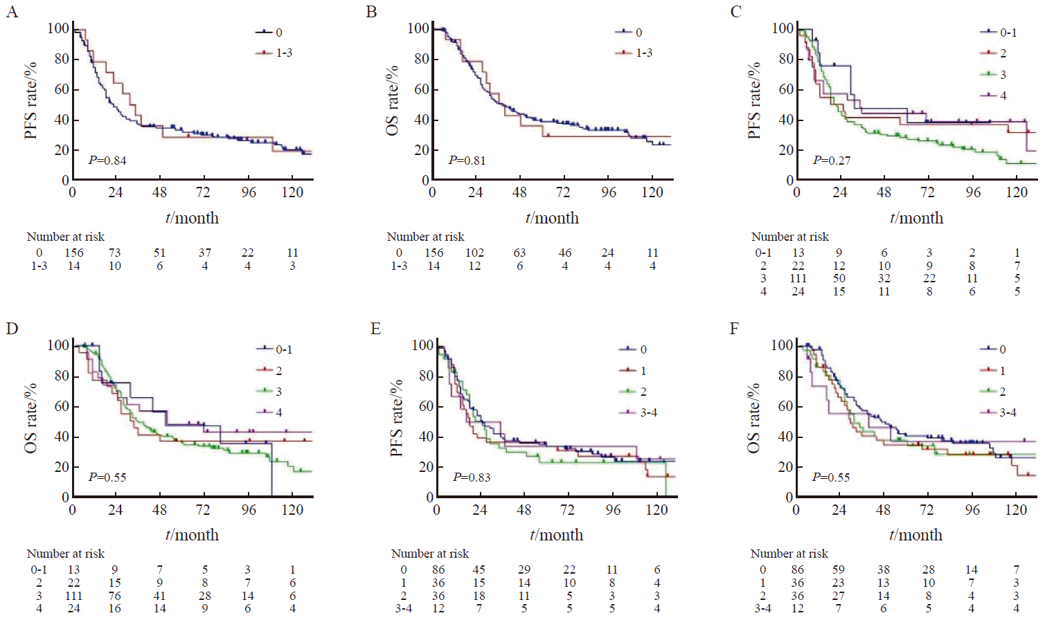 背景与目的: 尽管放射性淋巴细胞减少与某些恶性肿瘤的不良生存结局相关,但是关于小细胞肺癌(small cell lung cancer,SCLC)的研究证据仍较少。本研究旨在探讨放疗前后淋巴细胞计数是否能预测局限期SCLC(limited-stage SCLC,LS-SCLC)患者的临床预后。方法: 本研究为一项单中心回顾性队列研究。回顾性分析2007年1月—2017年12月在复旦大学附属肿瘤医院接受根治性放化疗的LS-SCLC患者。纳入标准包括:⑴ 经病理学检查确认为SCLC;⑵ 通过正电子发射计算机体层成像(positron emission tomography and computed tomography,PET/CT)、脑增强磁共振成像(magnetic resonance imaging,MRI)诊断为局限期[美国癌症联合会(American Joint Committee on Cancer,AJCC)第8版TNM分期M0];⑶ 接受了根治性放化疗;⑷ 具有放疗前、放疗期间及放疗后1个月的血常规数据;⑸ 可获得完整的生存、复发及末次随访信息。排除标准包括:⑴ 基线远处转移(AJCC第8版TNM分期M1,包括任何远处淋巴结、器官或骨髓转移);⑵ 放疗剂量小于50 Gy[以等效生物剂量2 Gy/次计算,即生物有效剂量(biological effective dose,BED)<40 Gy];⑶ 放疗前、放疗期间及放疗后的数据不完整;⑷ 无法获知生存、复发状态或末次随访记录不完整。本研究获得复旦大学附属肿瘤医院伦理委员会的批准(伦理编号:2303271-15),并豁免了患者的知情同意。采集的临床数据包括患者年龄、性别、美国东部肿瘤协作组体能状态(Eastern Cooperative Oncology Group performance status,ECOG PS)评分、吸烟史、肿瘤TNM分期、化疗方案与周期、放疗剂量与分割方式、是否同步放化疗、是否接受预防性颅脑照射(prophylactic cranial irradiation,PCI);实验室检查数据包括LS-SCLC患者在放疗前、放疗期间及放疗后1个月的淋巴细胞计数,根据不良事件通用术语标准(Common Terminology Criteria for Adverse Events,CTCAE)4.0版对淋巴细胞减少进行分级。使用Kaplan-Meier方法估计无进展生存期(progression-free survival,PFS)和总生存期(overall survival,OS),并用log-rank检验进行比较。结果: 共纳入170例患者。患者的中位年龄为57岁,男性占77.6%。中位放疗剂量为60 Gy(范围:45~66 Gy)。整组人群的中位PFS为22.0个月,5年PFS率为31.3%,10年PFS率19.8%;中位OS为38.0个月,5年OS率为37.5%,10年OS率24.2%。放疗前,有14例(8.2%)患者出现1~2级淋巴细胞减少;在放疗期间,出现1、2、3、4级淋巴细胞减少的患者分别为7例(4.1%)、22例(12.9%)、111例(65.3%)、24例(14.1%);在放疗后1个月,1级、2级、3级、4级淋巴细胞减少的患者分别有36例(21.2%)、36例(21.2%)、11例(6.5%)、1例(0.6%)。无论放疗前、中、后,各级淋巴细胞减少患者之间的PFS和OS均无显著差异。结论: 在免疫治疗前,放疗引起的淋巴细胞减少似乎不影响LS-SCLC患者的预后。