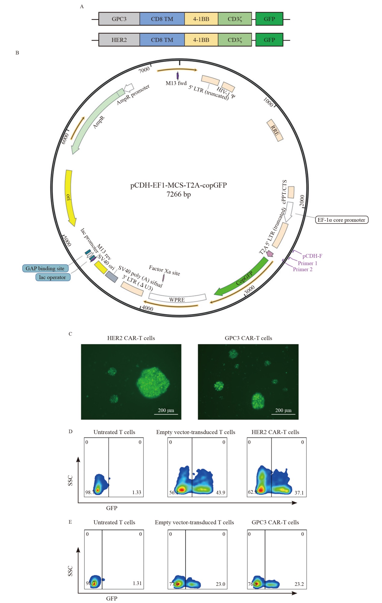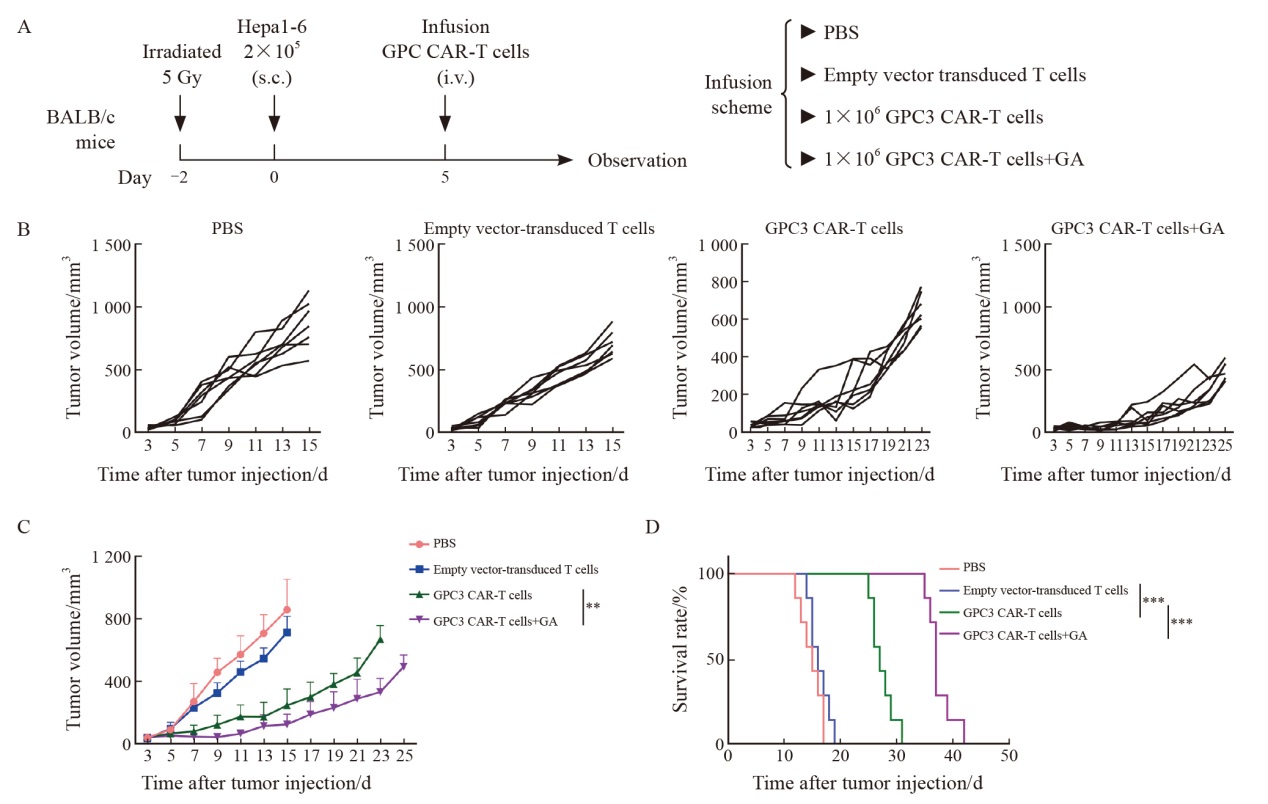 背景与目的:没食子酸(gallic acid,GA)具有诱导肿瘤细胞凋亡及抑制血管生成的作用。GA除了直接攻击肿瘤细胞外,另一个非常重要的作用是调节和增强免疫系统,例如,GA能够改善T细胞代谢,缓解T细胞耗竭,有助于T细胞形成记忆表型。当前已有多款嵌合抗原受体T(chimeric antigen receptor T,CAR-T)细胞产品获批上市,但CAR-T细胞依然存在较多缺陷,如脱靶效应、易耗竭等。另外,同耗竭一样,衰老也是限制T细胞发挥功能的一大因素。本研究旨在探讨GA对CAR-T细胞体内及体外抗肿瘤作用,GA对CAR-T细胞衰老表型和记忆表型的影响,以及GA和CAR-T细胞对肿瘤微环境(tumor microenvironment,TME)内免疫细胞浸润的影响。 方法:构建靶向小鼠磷脂酰肌醇蛋白聚糖3(glypican 3,GPC3)及靶向人表皮生长因子受体2(human epidermal growth receptor 2,HER2)的二代CAR,构建CAR-T细胞。使用5 μg/mL GA与CAR-T细胞共培养,采用流式细胞术检测CAR-T细胞的衰老状态和记忆表型,衰老指标包括p53、p21、γ-H2AX和衰老相关β半乳糖苷酶(senescence-associated β-galactosidase,SA-β-gal)等,记忆表型指标为CCR7。体外探究不同效靶比的CAR-T细胞对肿瘤细胞的杀伤能力。构建皮下移植瘤模型,探究GA对CAR-T细胞抗肿瘤作用以及对TME免疫细胞浸润的影响。 结果:成功构建了人源HER2 CAR-T细胞和鼠源GPC3 CAR-T细胞,阳性率在30%~50%之间。在此基础上,实验结果显示,在不同效靶比的情况下,GA可增强靶向小鼠GPC3及HER2 CAR-T细胞的体外杀伤能力(P<0.001),延缓小鼠GPC3 CAR-T细胞的衰老(p53,p21,γ-H2AX,P<0.05;SA-β-gal,P<0.001;CCR7,P<0.001),并且GA能够促进CAR-T细胞向记忆表型分化(P<0.001)。同时,GPC3 CAR-T细胞能够抑制肿瘤细胞的生长(P<0.05),延长小鼠生存期(P <0.001),增强CAR-T细胞(P<0.001)和内源性免疫细胞的浸润能力[CD4+ T细胞,P<0.05;CD8+ T细胞,P<0.01;自然杀伤(natural killer,NK)细胞,P<0.01]。 结论:GA可增强CAR-T细胞的体外杀伤能力,延缓CAR-T细胞衰老表型,促进CAR-T细胞向记忆表型分化,增强CAR-T细胞抗肿瘤作用,通过改善TME,提高免疫细胞浸润能力。