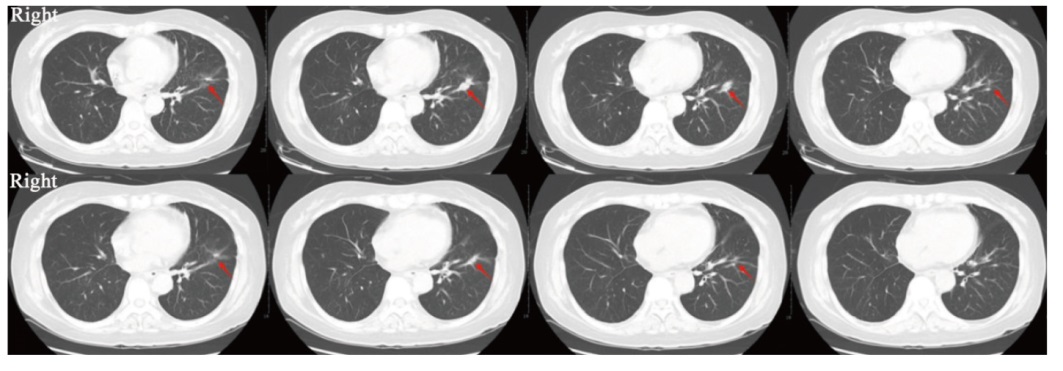 | Fig. 4 Comparison of primary lung lesions before and after treatment in the fifth patient The red arrow indicates the regressed primary lung lesion. |